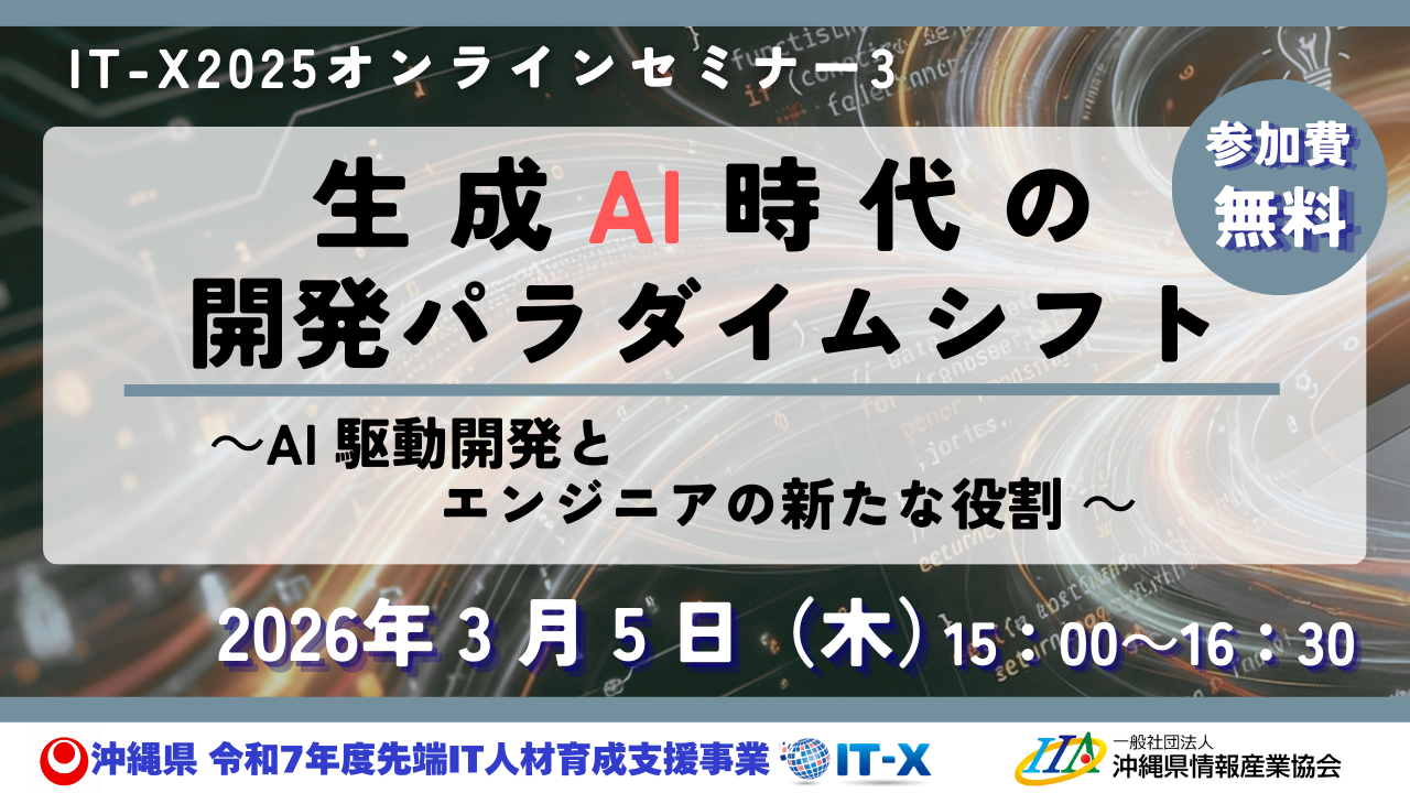 沖縄県情報産業協会(IIA)では、沖縄県事業「令和7年度先端IT人材育成支援事業」を受託し、先端IT技術者の育成・高度化を図る「IT-X(アイティ・クロス)事業」を実施し...