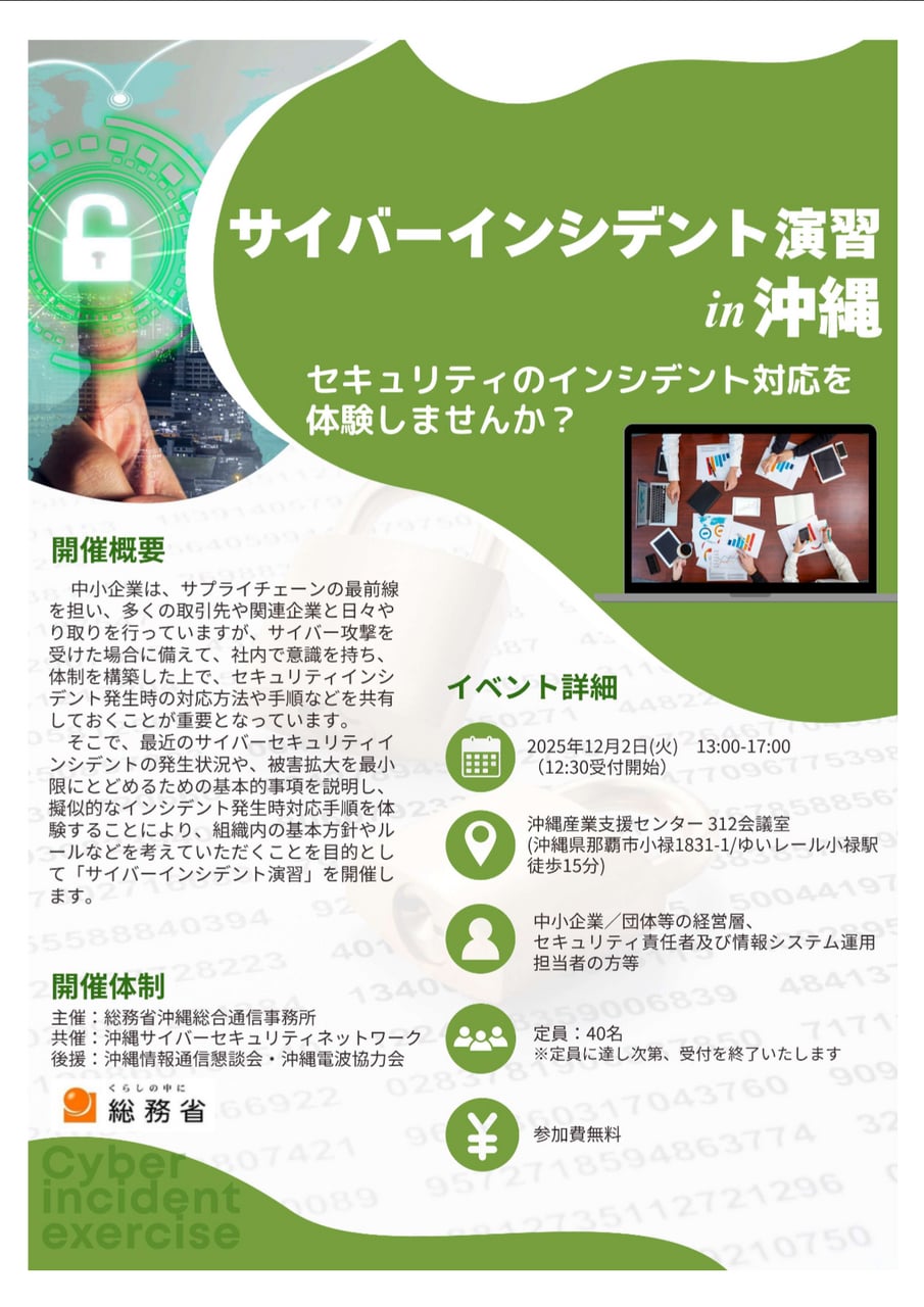 【総務省沖縄総合通信事務所】様より、「サイバーインシデント演習in沖縄」についてお知らせがありましたのでご案内いたします。
