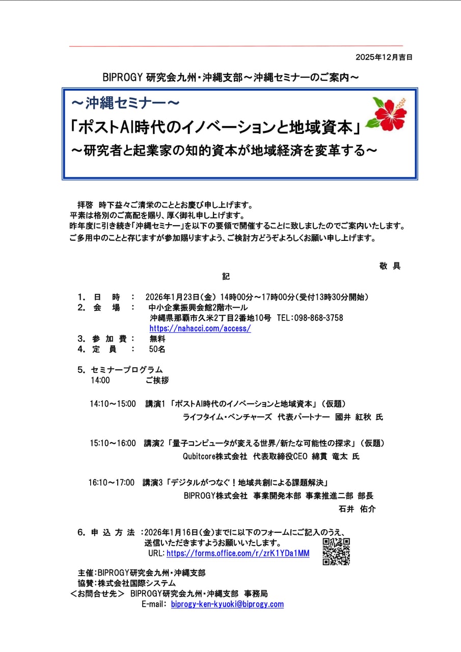 BIPROGY研究会九州・沖縄支部では、1月23日(金)に沖縄セミナーを開催いたします。