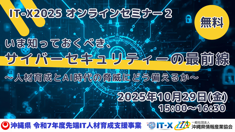 沖縄県情報産業協会(IIA)では、沖縄県事業「令和7年度先端IT人材育成支援事業」を受託し、先端IT技術者の育成・高度化を図る「IT-X(アイティ・クロス)事業」を実施しております。その一環で行う、IT-X2025オンラインセミナー2「いま知っておくべき、サイバーセキュリティの最前線~人材育成とAI時代の脅威にどう備えるか~」のご案内です。
