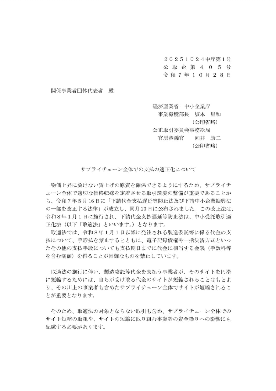【経済産業省中小企業庁】サプライチェーン全体での支払の適正化についての周知のお願い